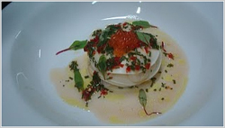 Cortas as laminas de palmito com a ajuda de um Mandolin e depois fazer as camadas: vieiras e musse + palmito + vieiras e musse + palmito + vierias e musse + palmito. Regar com a vinagrete, colocar as ovas de salmão e finalizar com as mini rúculas.